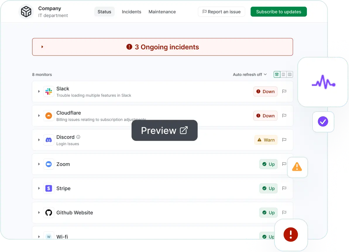 Monitor all your cloud infrastructure providers including AWS, Azure, Google Cloud, and more. Get instant alerts on service disruptions.